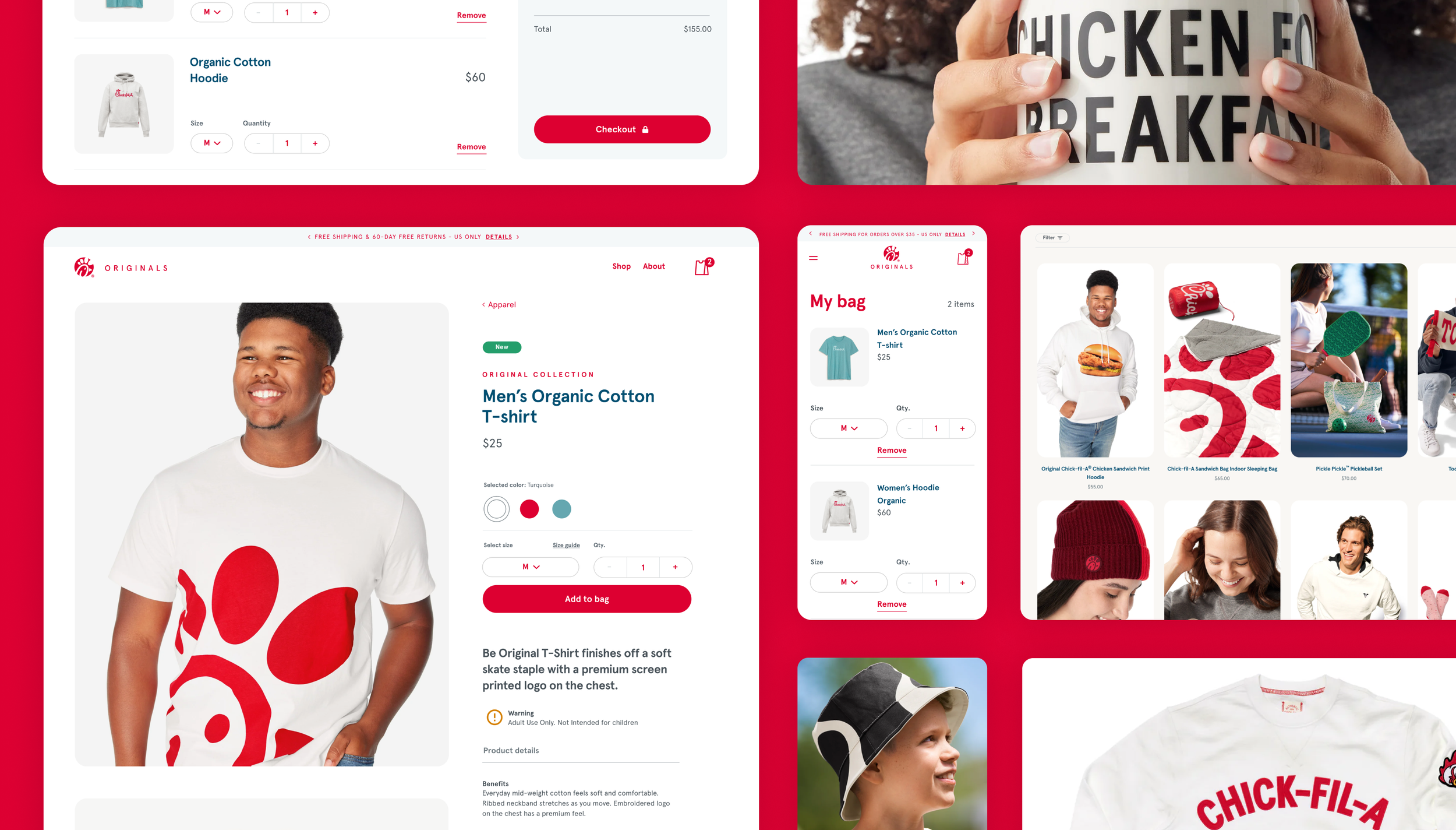 The project encompassed end-to-end UX design, site architecture, and art direction, ensuring flexibility for the internal team to create distinct visual themes for each collection. By crafting a scalable system that balanced brand consistency with creative adaptability, we empowered Chick-fil-A to seamlessly engage customers and build anticipation for their exclusive merchandise releases.