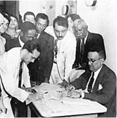 Luis Muñoz Marín signing into the founding documents of the PPD, 1938.